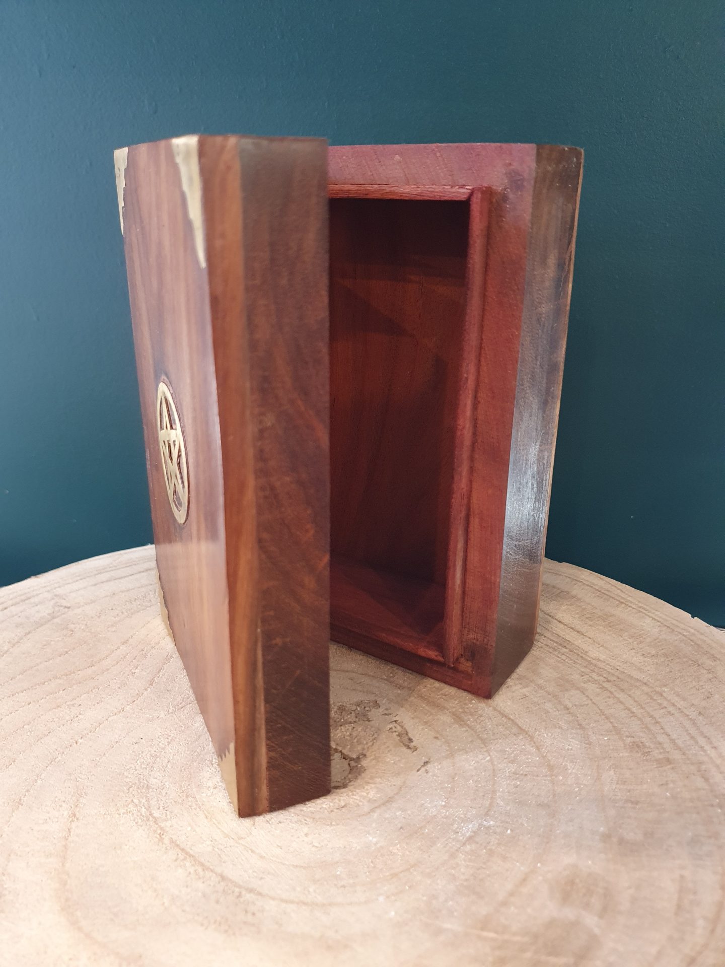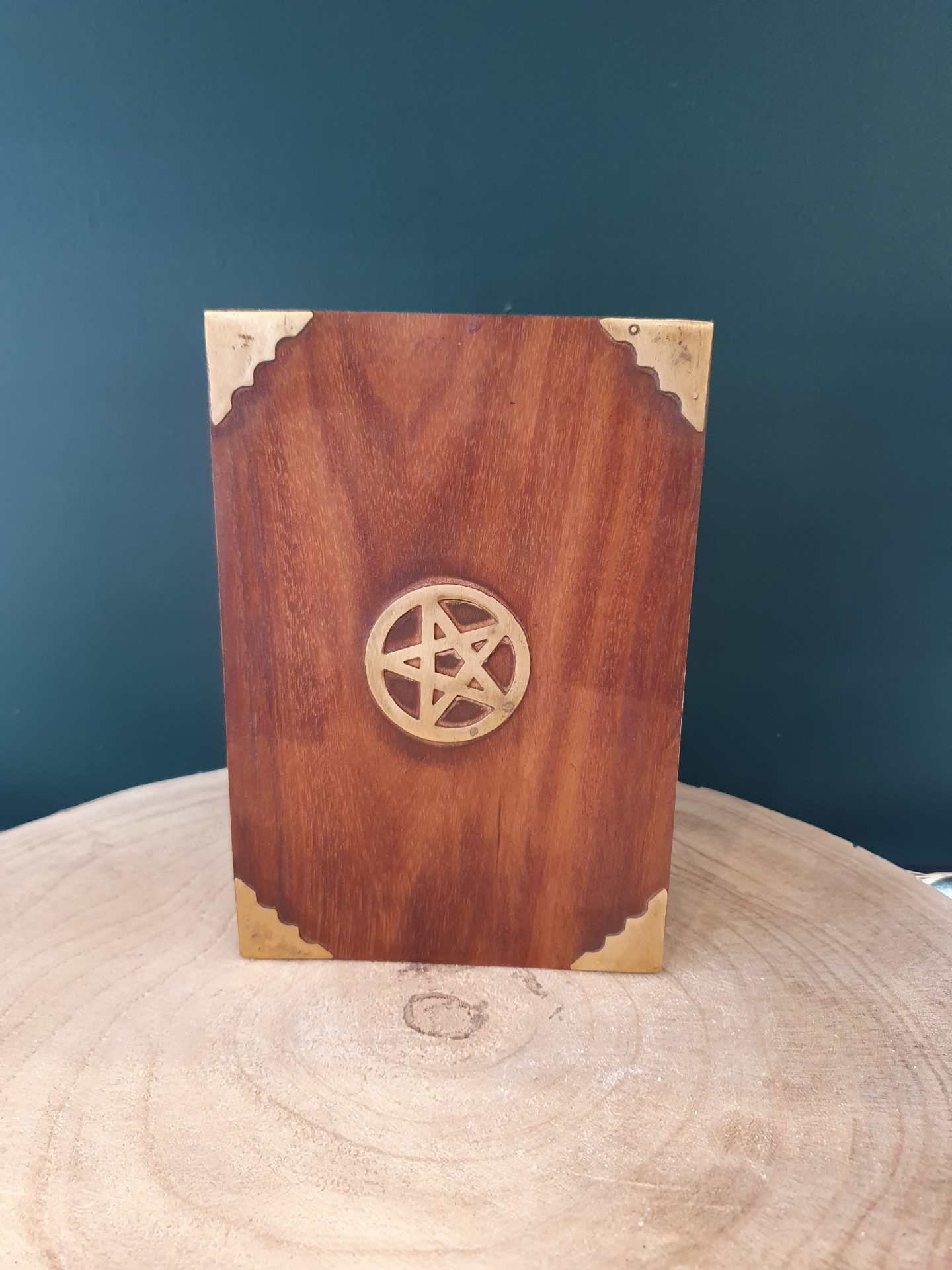 Découvrez notre boîte de rangement en bois ornée d'un splendide pentacle doré pour organiser avec élégance vos trésors. Parfait pour vos minéraux et bijoux précieux.