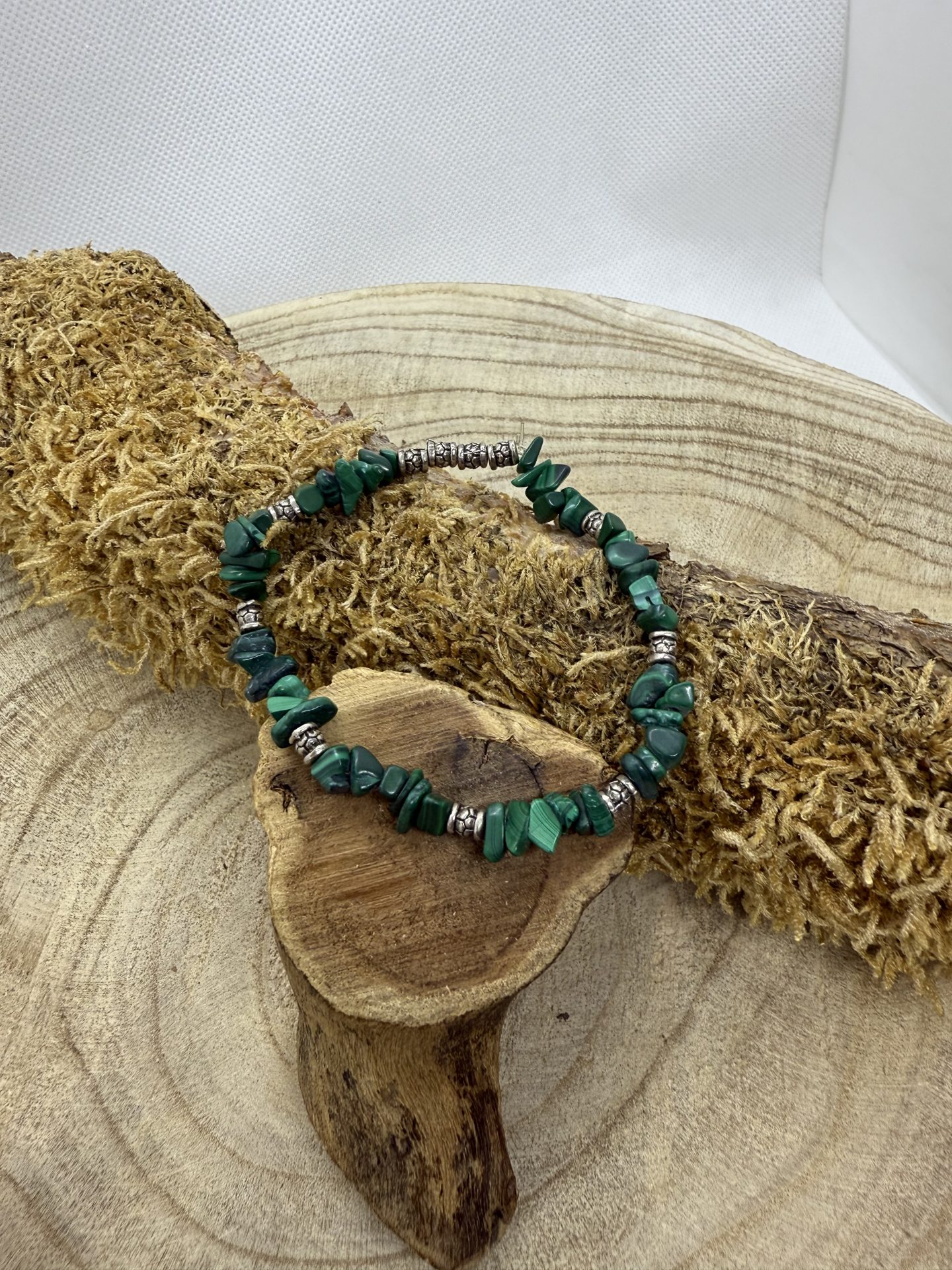 Ce bracelet en malachite sculpté en forme de pierre baroque, monté sur un élastique, apporte harmonie et équilibre pour favoriser le bien-être.