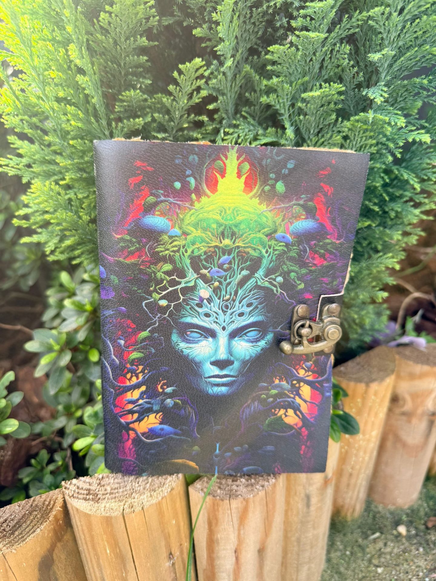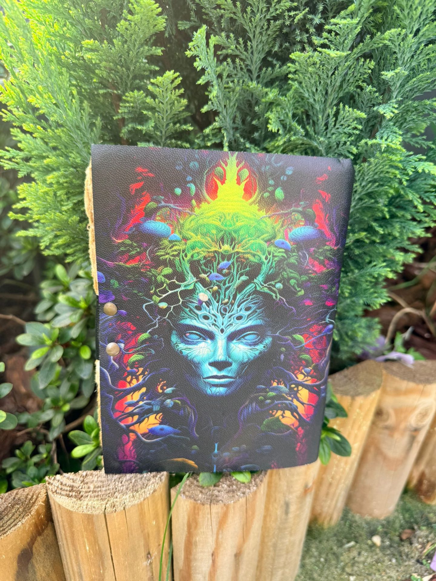Ce grimoire enchanteur présente un motif de visage de femme nature, avec des pages en parchemin ancien. Un compagnon magique pour les amateurs de mystère et de sortilèges.