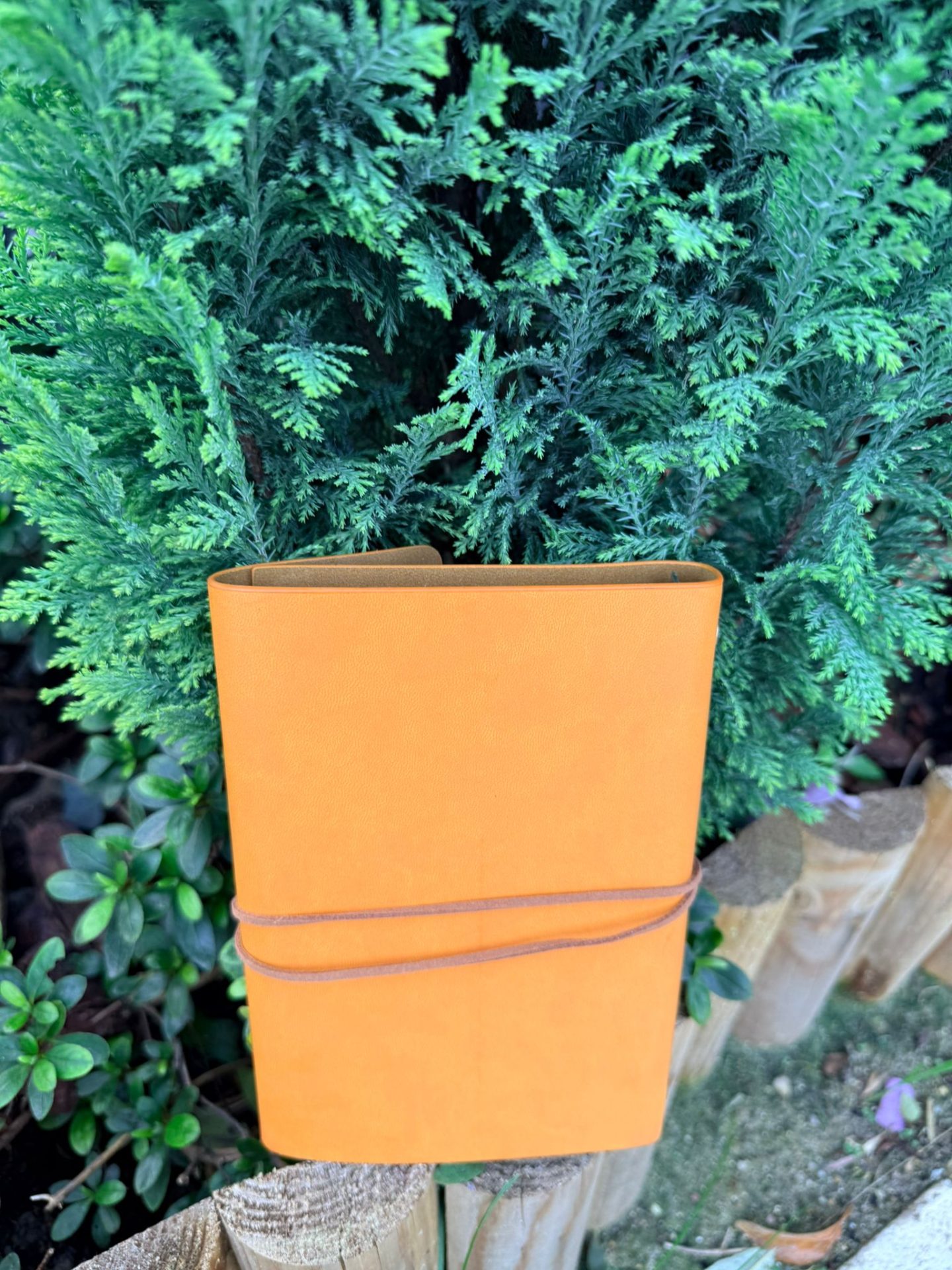 Ce grimoire livre orange aux pages cartonnées marron dans une couverture en cuir ornée de motifs feuilles est l'accessoire parfait pour les amateurs de mystère et de magie.